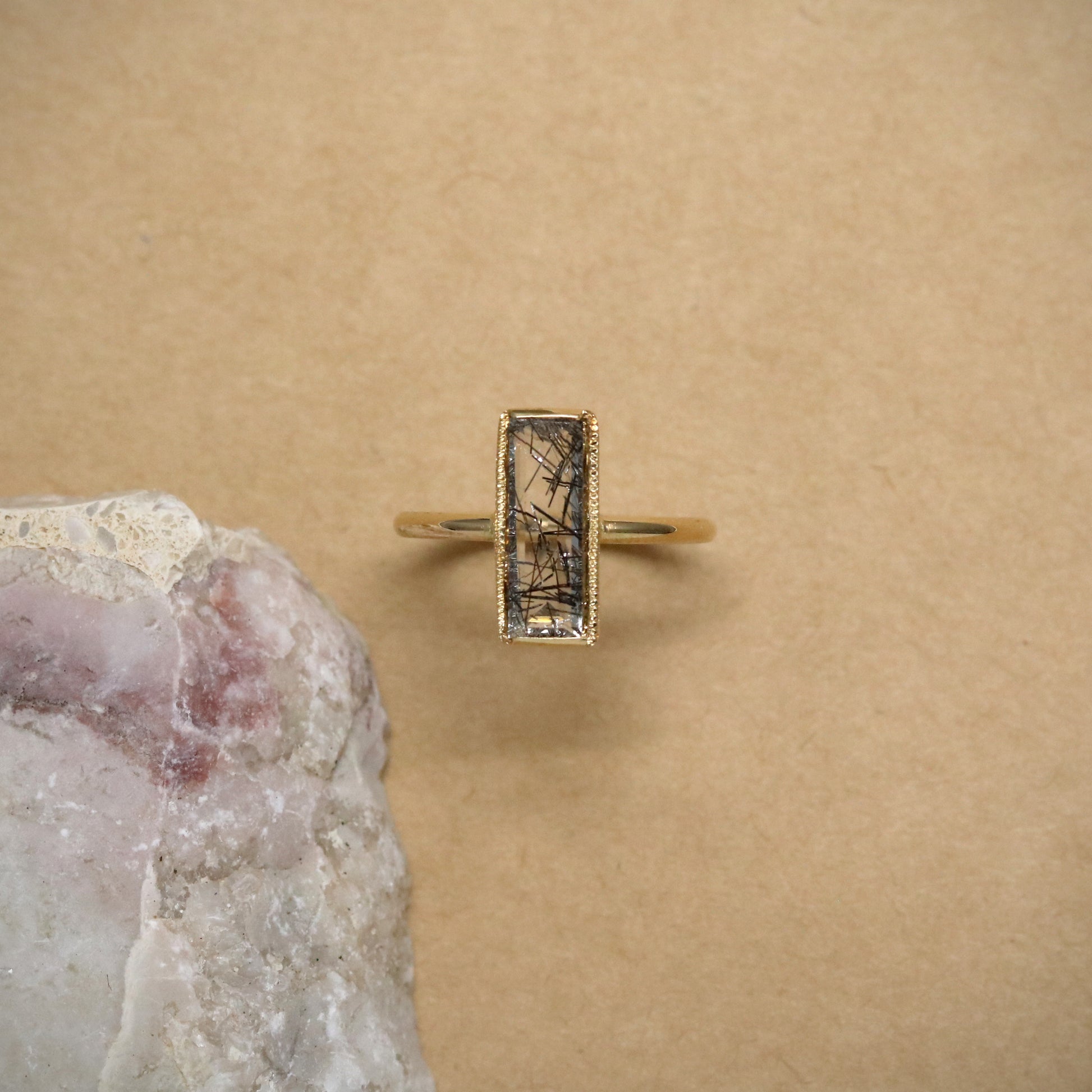 不思議な内包物のある長方形のブラックルチルクォーツを留めた華奢なリング。