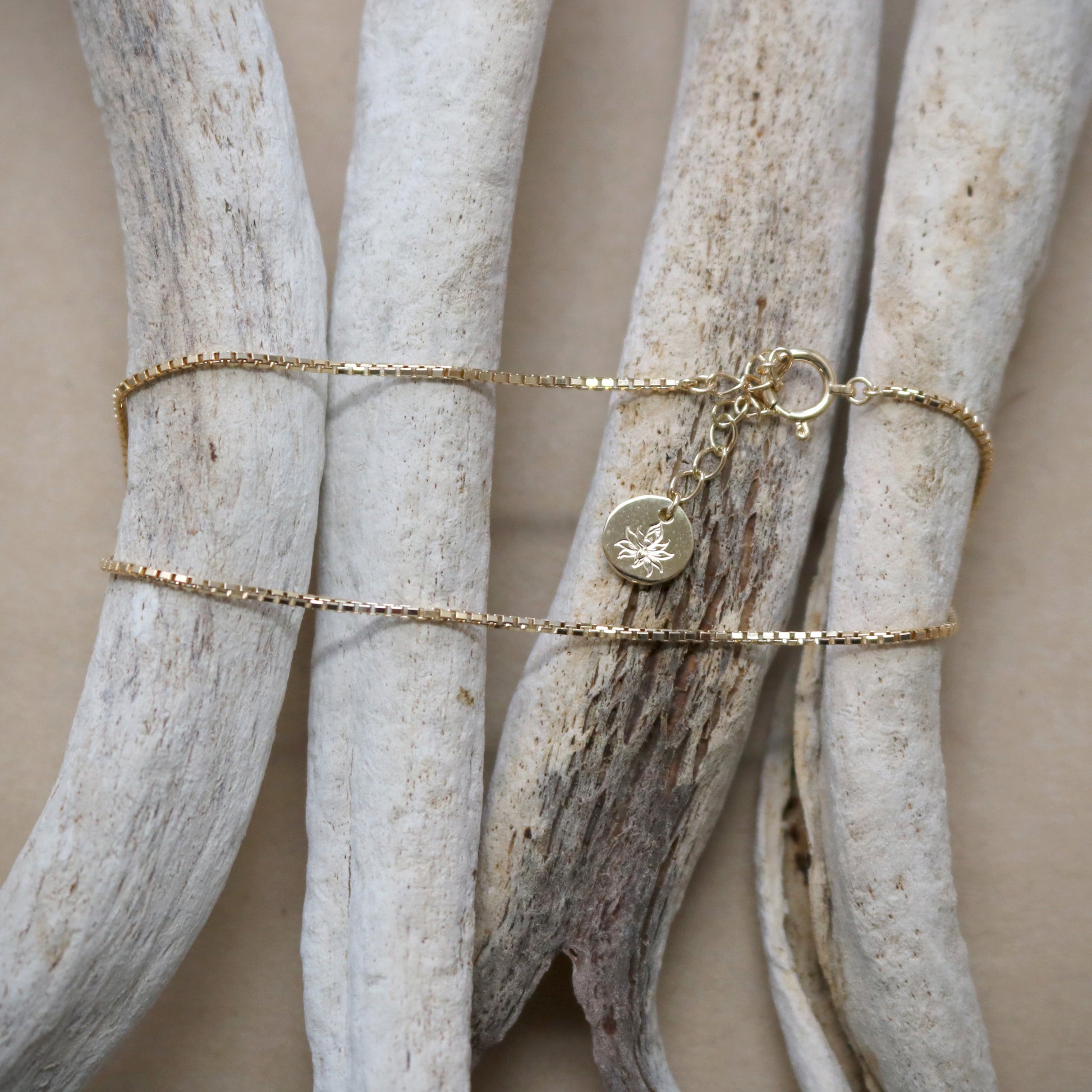 蓮の花の彫られたチャームをヴェネチアンチェーンに付けたシンプルなアンクレット。