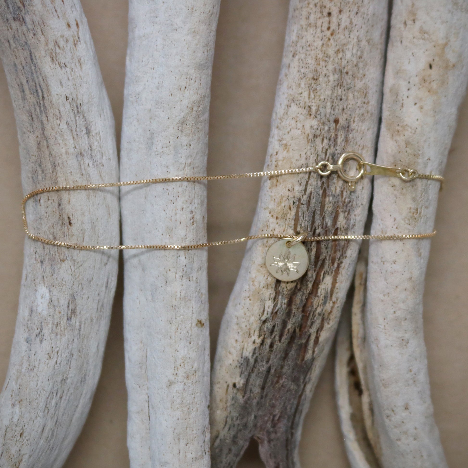 蓮の花の彫られたチャームをヴェネチアンチェーンに付けたシンプルなアンクレット。