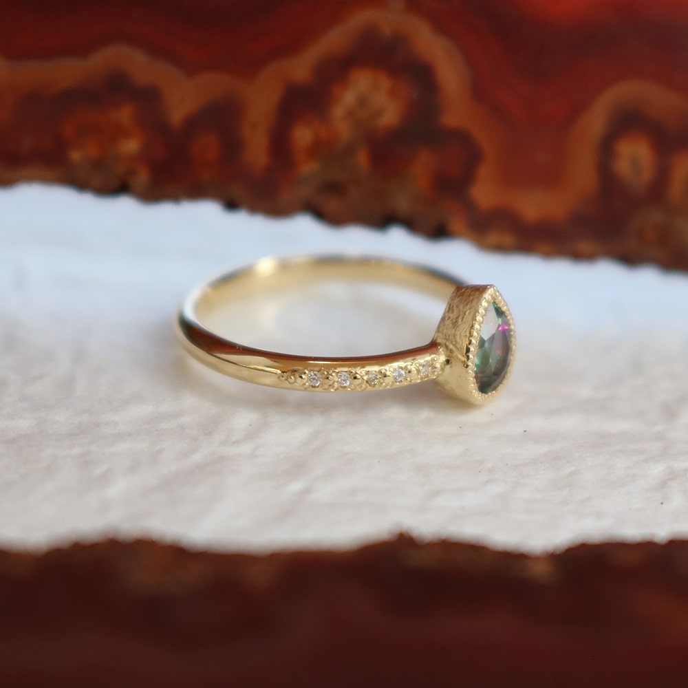 18金のリングにペアシェイプカットのミスティック・トパーズを留めた重ね付けにも向いている商品です。